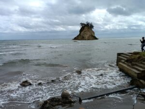 車の中で黒梅さんの説明を聞きながら、しばらく被災地を進んだ後、最初に下車したのは、珠洲市の東海岸の見附島(みつけじま)が見える場所でした。