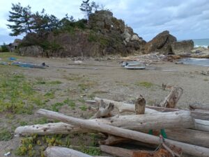 西海岸の曽々木海岸(そぞぎかいがん)です。珠洲市との境に近い輪島市にあります。洞門や奇岩が続く景勝地でしたが、窓岩は崩れ、海岸には岩が隆起し流木やゴミなどが放置されたままでした。