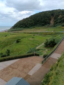 白米(しろよね)千枚田です。輪島市白米町にある棚田で、日本の棚田百選にも選ばれています。地震で水が引けなくなって稲作ができなくなりました。それでも修復を続け、少しだけ田植えも行われているようです。