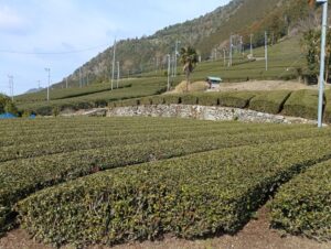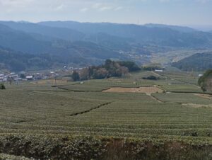 原山集落を通って、最初は、茶畑の作業道の急坂を登って行く。黄砂のせいか、やや霞んでいるが、さすが「茶源郷」と呼ばれるだけある、見事な景観だ。
