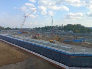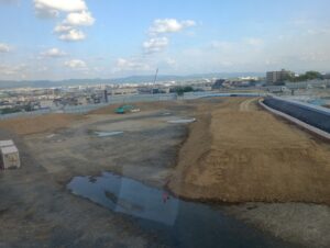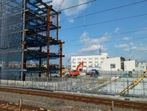 下の写真の右側は建設中の5階建ての駅ビル。その向こう側の重機がある辺りがタワマン建設予定地。